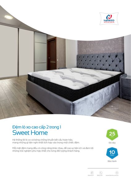 - Đệm lò xo Sweethome là sự kết hợp hoàn hảo giữa hệ thống lò xo và bông kháng khuẩn tạo nên sự vững chắc, giấc ngủ trọn vẹn cho gia đình bạn.